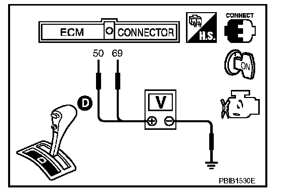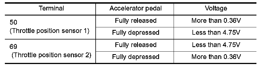 5. Check voltage between ECM terminals 50 (TP sensor 1signal), 69 (TP sensor 2signal) and engine ground under the given conditions.