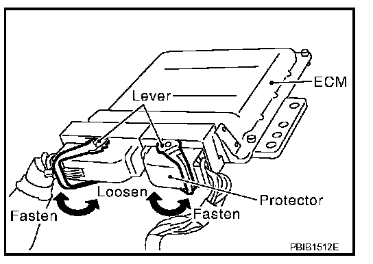 3. When disconnecting ECM harness connector, loosen it with levers as far as they will go as shown at right.
