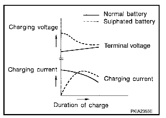 To determine if a battery has been "sulphated", note its voltage and current when charging it. As shown in the figure, less current and higher voltage are observed in the initial stage of charging sulphated batteries.