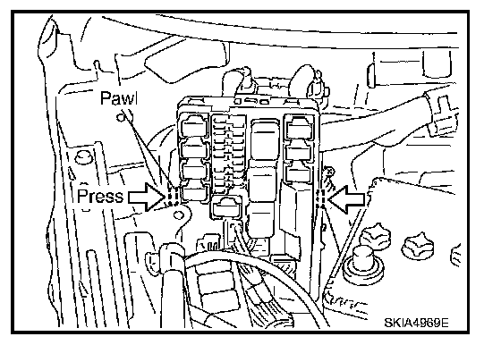 3. While pressing pawls on right and left side of IPDM E/R, remove IPDM E/R cover B from IPDM E/R.