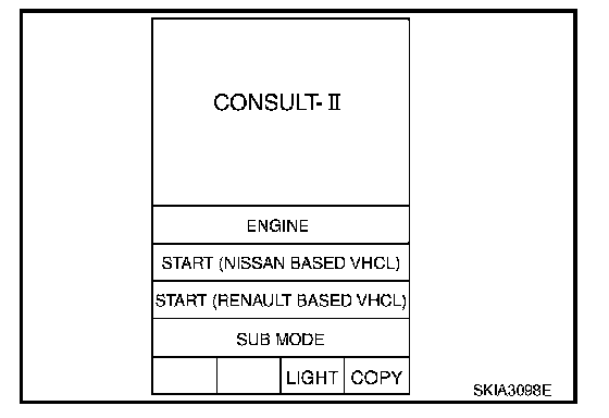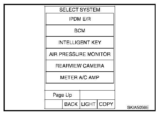 - If "IPDM E/R" is not displayed, print "SELECT SYSTEM" screen, then Refer to "CONSULT-II Data Link Connector (DLC) Circuit". CONSULT-II Checking System