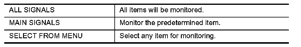 4. Touch the required monitoring item on "SELECT ITEM MENU". In "ALL SIGNALS", all items are monitored. In "MAIN SIGNALS", predetermined items are monitored.