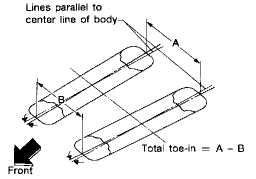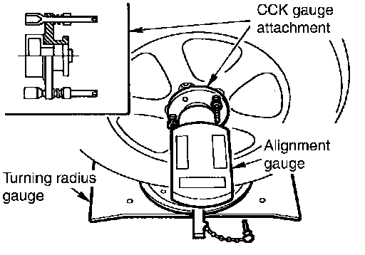 ^ Before inspection, mount front wheels onto turning radius gauge. Mount rear wheels onto a stand that has same height so vehicle will remain horizontal.