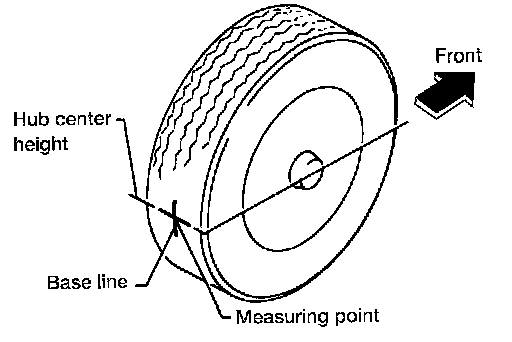 3. Put a mark on base line of the tread (rear side) of both tires at the same height as hub center. These are measuring points.