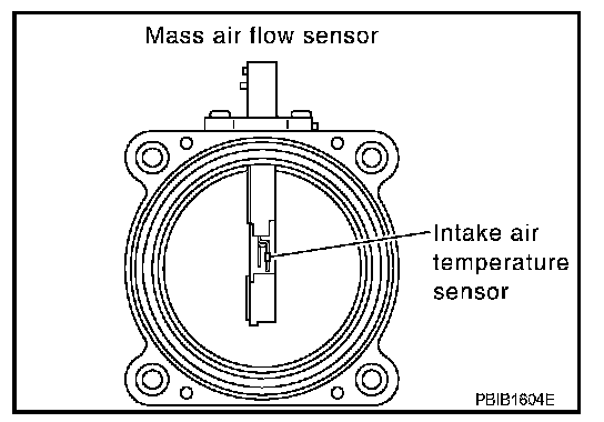 The mass air flow sensor is placed in the stream of intake air. It measures the intake flow rate by measuring a part of the entire intake flow. It consists of a hot film that is supplied with electric current from the ECM. The temperature of the hot film is controlled by the ECM a certain amount. The heat generated by the hot film is reduced as the intake air flows around it. The more air, the greater the heat loss. Therefore, the ECM must supply more electric current to maintain the temperature of the hot film as air flow increases. The ECM detects the air flow by means of this current change.