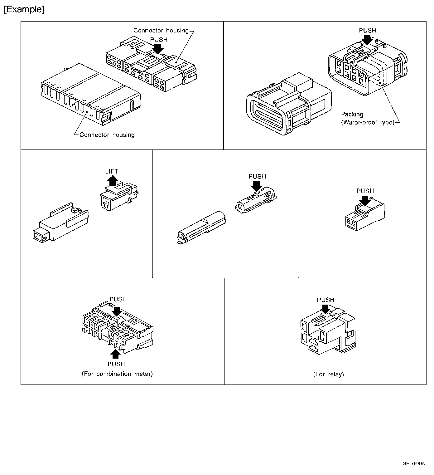 - The tab-locking type connectors are disconnected by pushing or lifting the locking tab(s). Refer to the illustration.