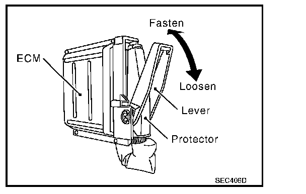 - When connecting ECM harness connector, fasten it securely with a lever as far as it will go as shown in the figure.