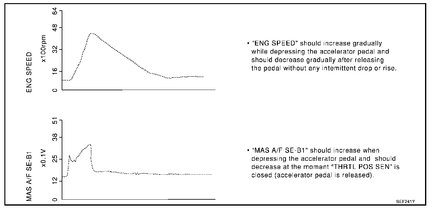 The signal of "ACCEL SEN1" and "THRTL SEN1" should rise gradually without any intermittent drop or rise after "CLSD THL POS" is changed from "ON" to "OFF".