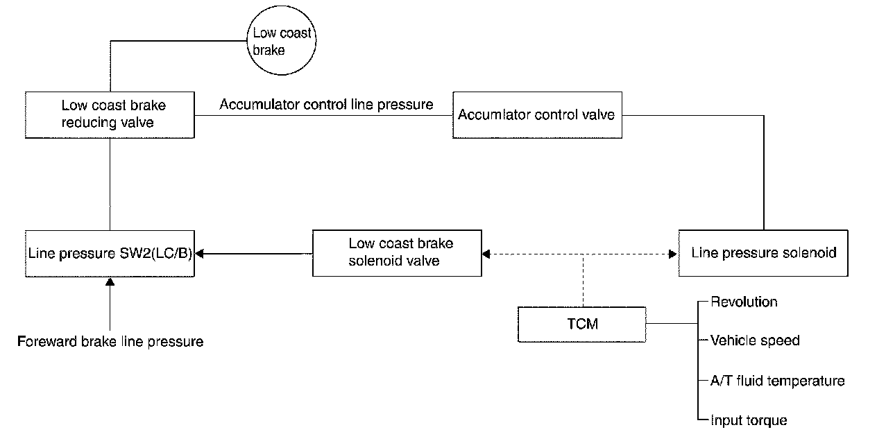 ^ The operation of the low coast brake solenoid switches the low coast brake switching valve and controls the coupling and releasing of the low coast brake. The low coast brake reducing valve controls the low coast brake coupling force.
