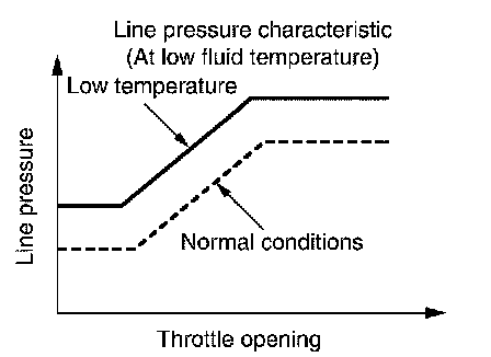 When the A/T fluid temperature drops below the prescribed temperature, in order to speed up the action of each friction element, the line pressure is set higher than the normal line pressure characteristic.
