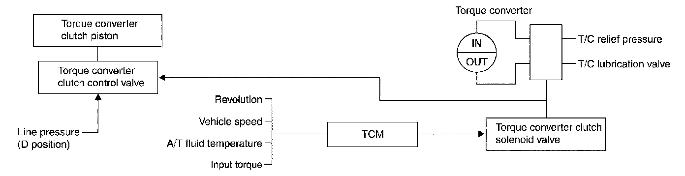 The torque converter clutch control valve operation is controlled by the torque converter clutch solenoid valve, which is controlled by a signal from TCM, and the torque converter clutch control valve engages or releases the torque converter clutch piston.
