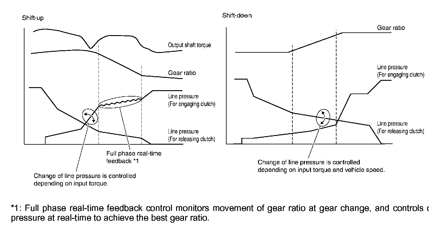 Shift ControlThe clutch pressure control solenoid is controlled by the signals from the switches and sensors. Thus, the clutch pressure is adjusted to be appropriate to the engine load state and vehicle driving state. It becomes possible to finely control the clutch hydraulic pressure with high precision and a smoother shift change characteristic is attained.