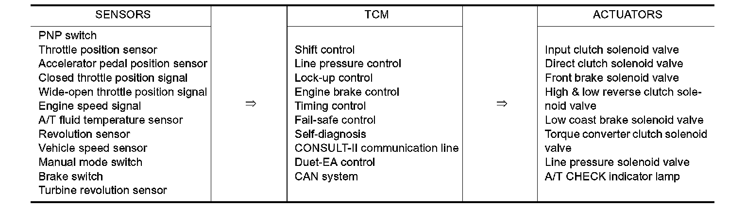 The automatic transmission senses vehicle operating conditions through various sensors or signals. It always controls the optimum shift position and reduces shifting and lock-up shocks.