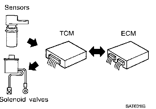 The TCM also communicates with the ECM by means of a signal sent from sensing elements used with the OBD-related parts of the A/T system for malfunction-diagnostic purposes. The TCM is capable of diagnosing malfunctioning parts while the ECM can store malfunctions in its memory.