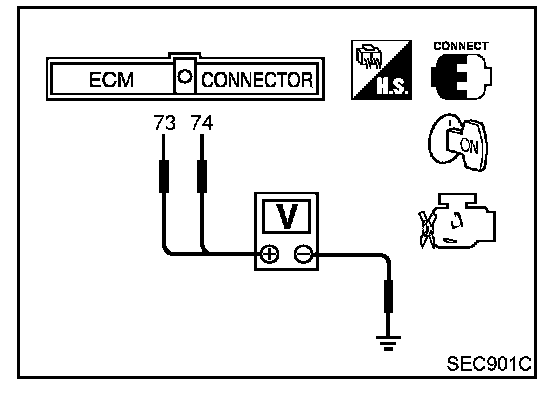3. Check voltage between ECM terminals 73 (APP sensor 1 signal), 74 (APP sensor 2 signal) and engine ground under the given conditions.