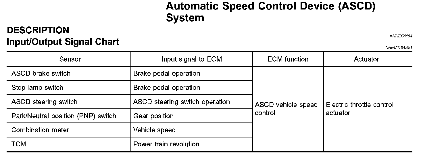 ECM controls throttle valve operating angle of electric throttle control actuator to regulate engine speed. Operation status of ASCD is indicated by CRUISE indicator and SET indicator in combination meter. If any malfunction occurs in ASCD system, it automatically deactivates control.