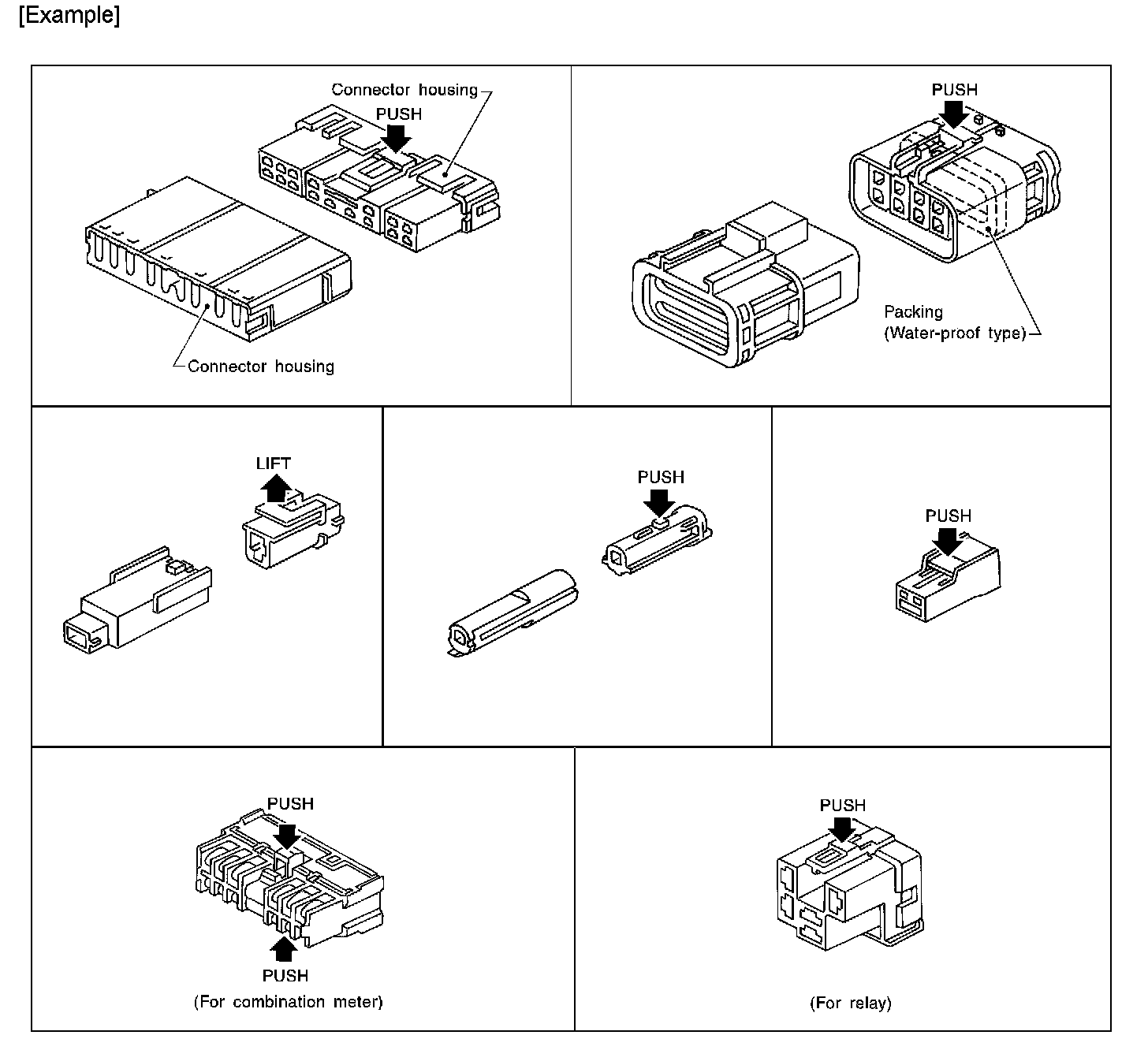 - The tab-locking type connectors are disconnected by pushing or lifting the locking tab(s). Refer to the illustration.