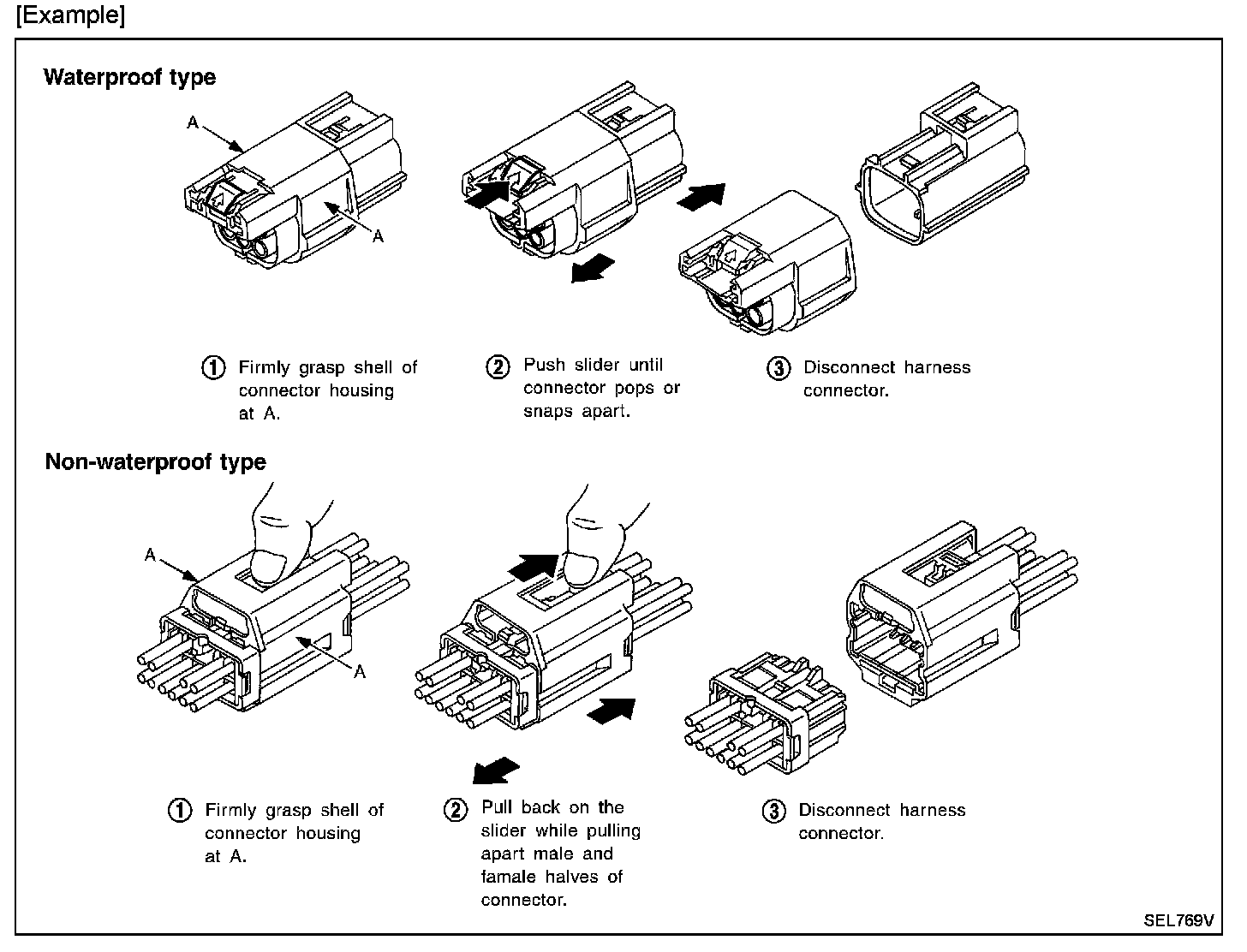- Do not pull the harness or wires when disconnecting the connector.