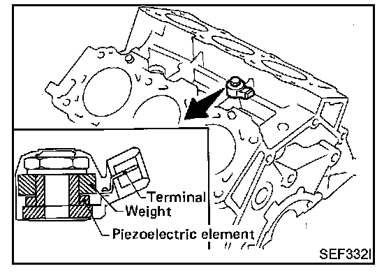 knock sensor is attached to the cylinder block. It senses engine knocking using a piezoelectric element. A knocking vibration from the cylinder block is sensed as vibrational pressure. This pressure is converted into a voltage signal and sent to the ECM.