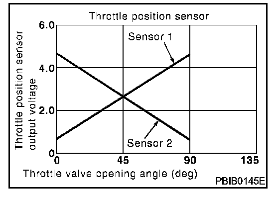 The throttle position sensor has the two sensors. These sensors are a kind of potentiometers which transform the throttle valve position into output voltage, and emit the voltage signal to the ECM. In addition, these sensors detect the opening and closing speed of the throttle valve and feed the voltage signals to the ECM. The ECM judges the current opening angle of the throttle valve from these signals and the ECM controls the throttle control motor to make the throttle valve opening angle properly in response to driving condition.