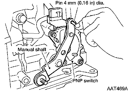 4. Insert pin into adjustment holes in both Park/Neutral Position (PNP) switch and manual shaft as near vertical as possible.