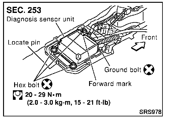 4. Remove ground bolt and also remove bolts from diagnosis sensor unit.