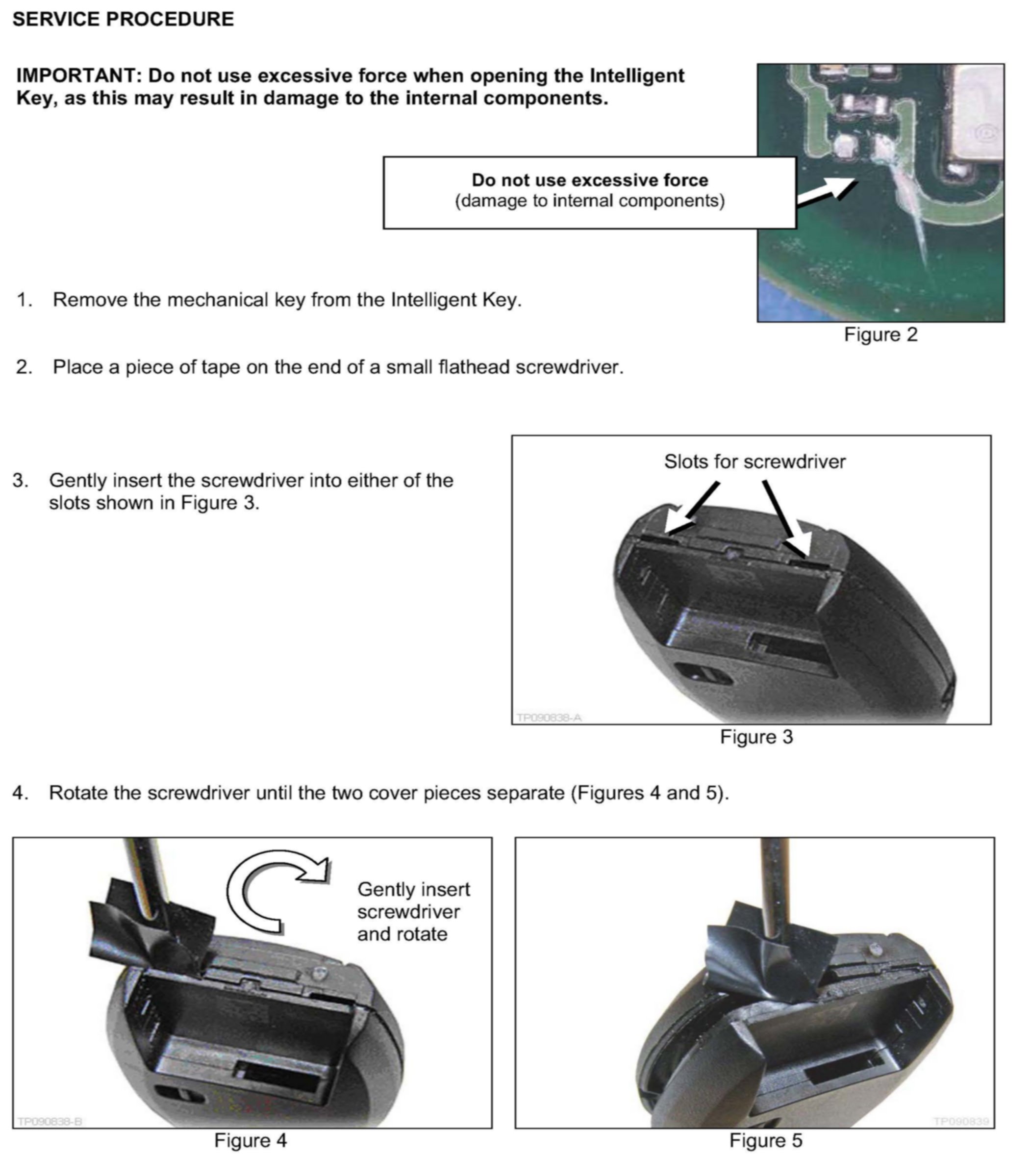 DO NOT insert a tool into the notches of the Intelligent Key (if equipped) to pry it open, as this may damage the printed circuit board (PCB).