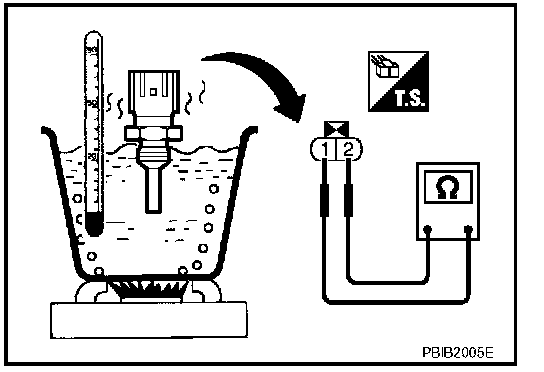 1. Check resistance between engine coolant temperature sensor terminals 1 and 2 as shown in the figure.