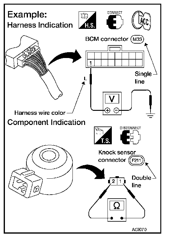 - Connector symbols shown from the harness side are enclosed by a double line and followed by the direction mark.