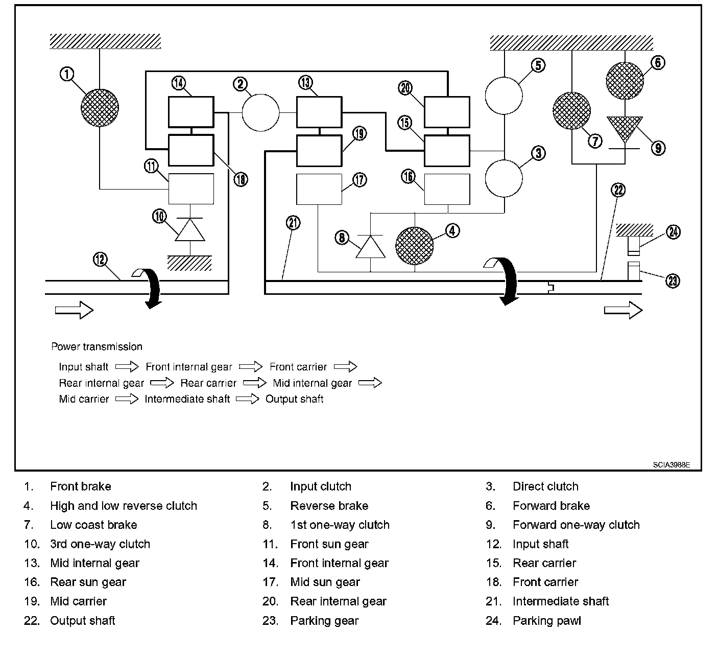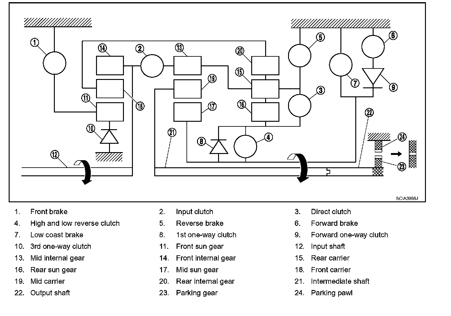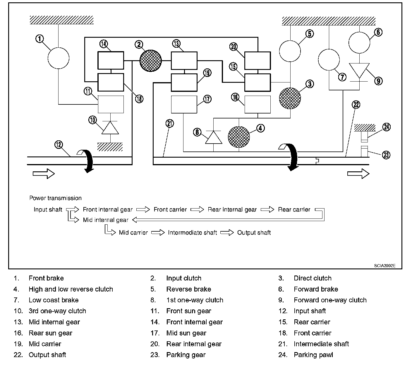 ^ The forward brake and the forward one-way clutch regulate reverse rotation of the mid sun gear.