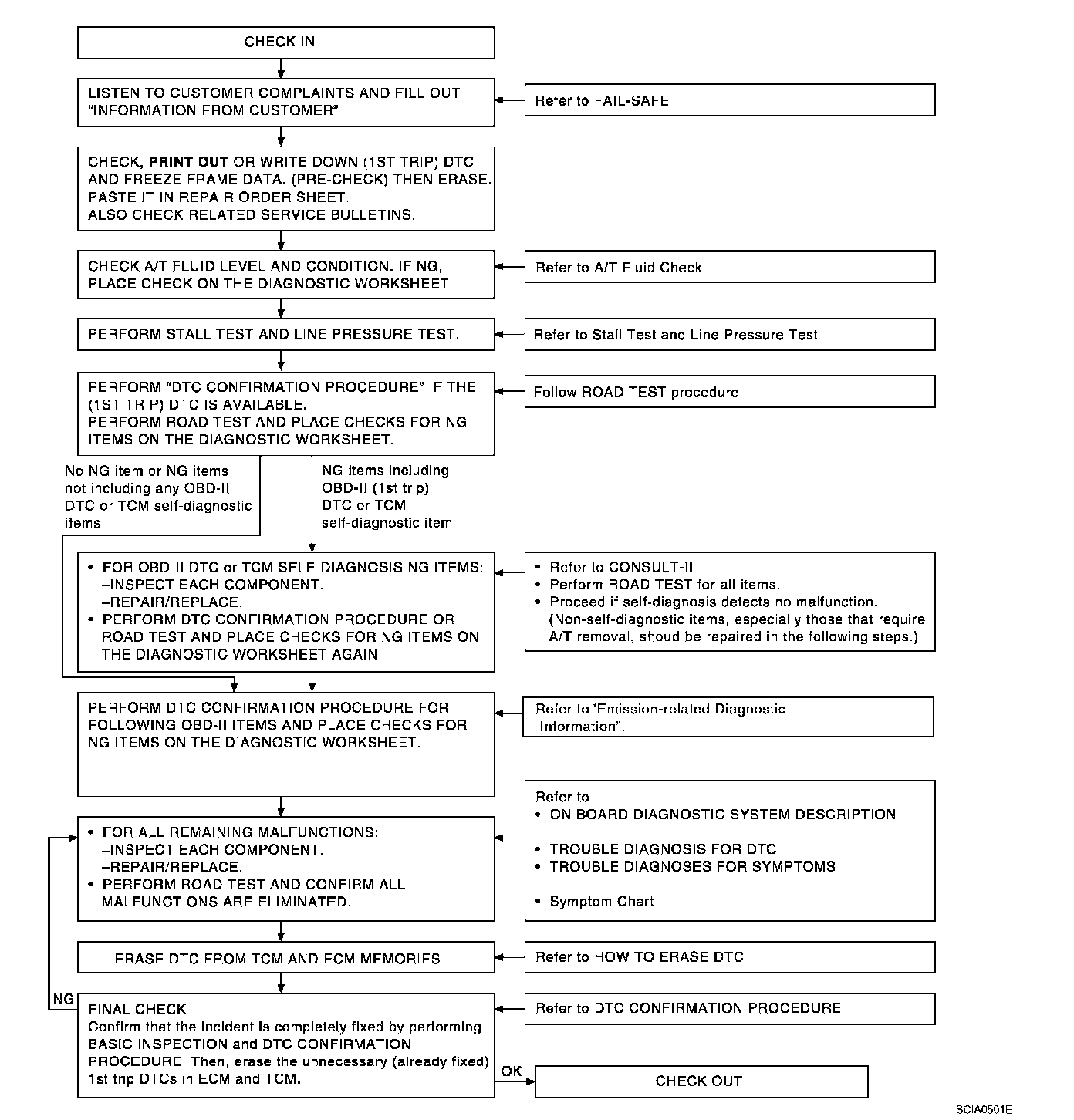 WORK FLOWA good understanding of the malfunction conditions can make troubleshooting faster and more accurate. In general, each customer feels differently about a malfunction. It is important to fully understand the symptoms or conditions for a customer complaint. Make good use of the two sheets provided, Information From Customer and Diagnostic Worksheet, to perform the best troubleshooting possible.