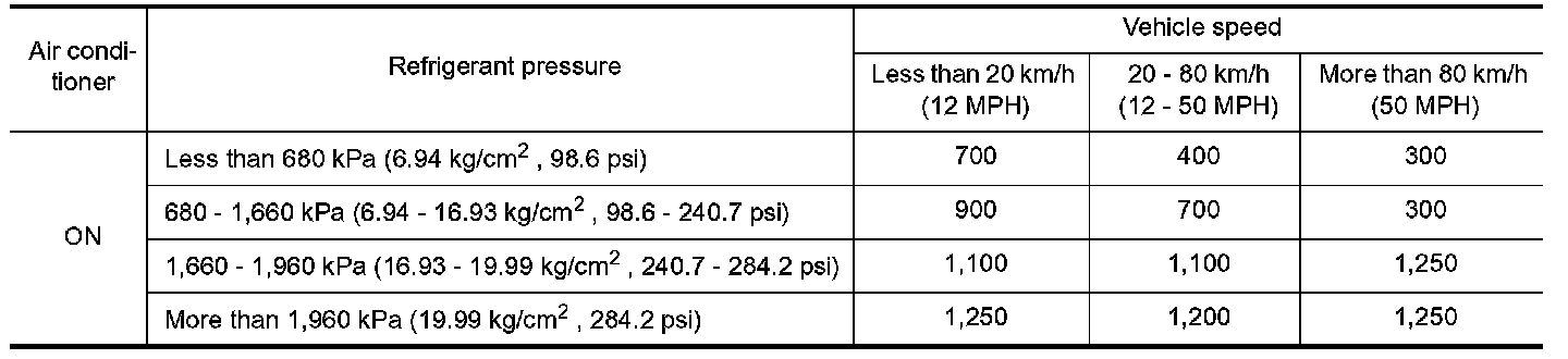 The ECM determines the target fan speed based on the basic fan speed considering the radiator coolant temperature and the engine speed. The ECM controls fan speed between 0 to 2,550 rpm.
