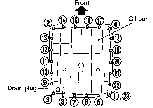 Tighten oil pan mounting bolts to the specified torque in numerical order shown in the figure after temporarily tightening them.