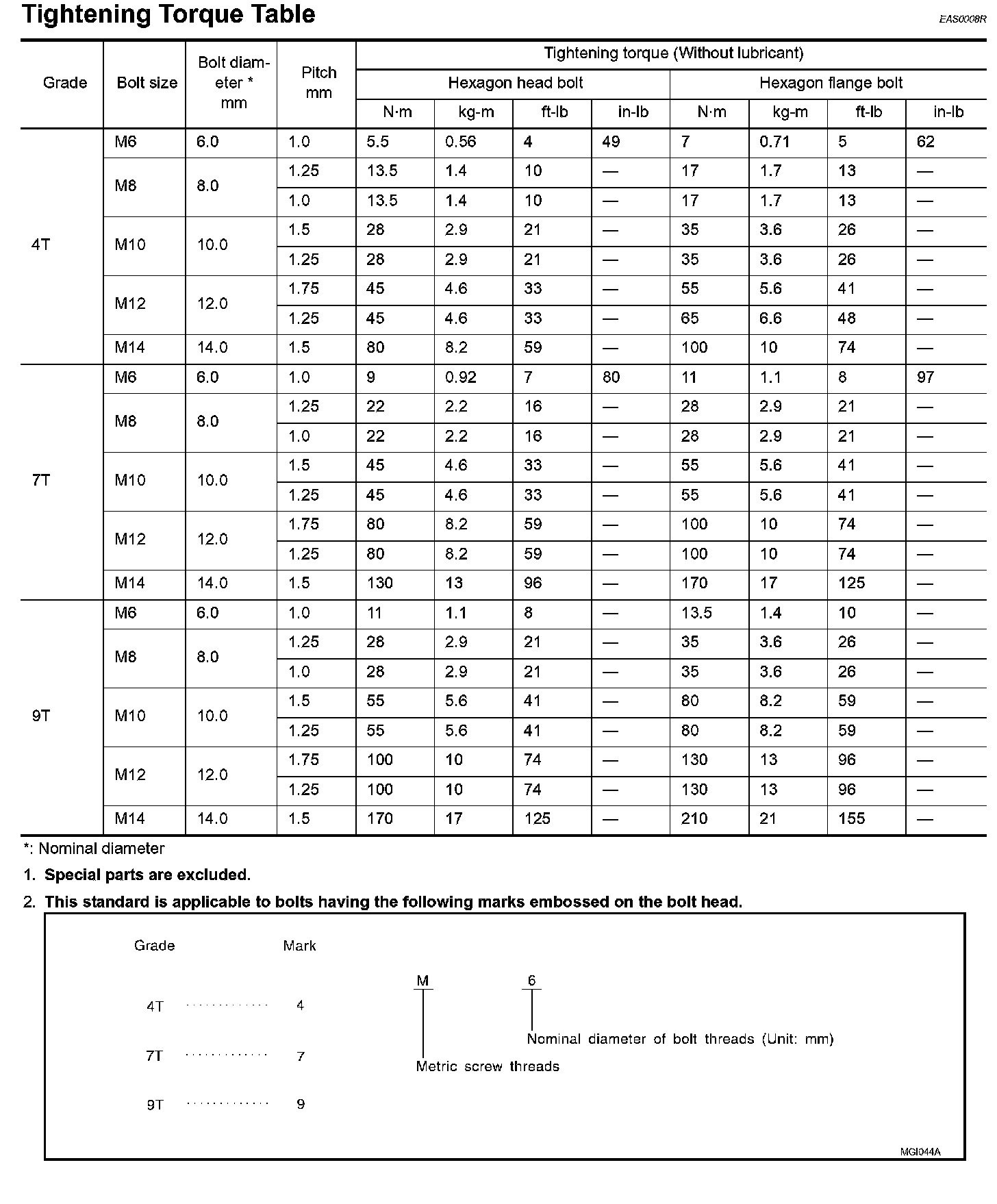 Tightening Torque Of Standard Bolts:
