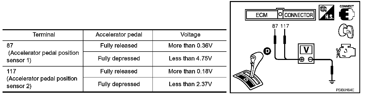3. Check voltage between ECM terminals 87 (APP sensor 1 signal), 117 (APP sensor 2 signal) and engine ground under the given conditions.