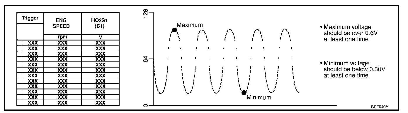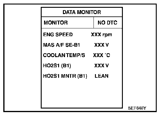 - "HO2S1 MNTR (B1)/(B2)" in "DATA MONITOR" mode changes from "RICH" to "LEAN" to "RICH" more than 5 times in 10 seconds. 5 times (cycles) are counted as shown at right.