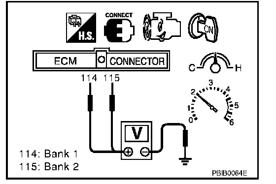 2. Set voltmeter probes between ECM terminal 114 [HO2S1 (B1) signal] or 115 [HO2S1 (B2) signal] and engine ground.