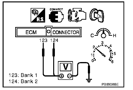 5. Set voltmeter probes between ECM terminal 123 [HO2S2 (B1) signal] or 124 [HO2S2 (B2) signal] and engine ground.