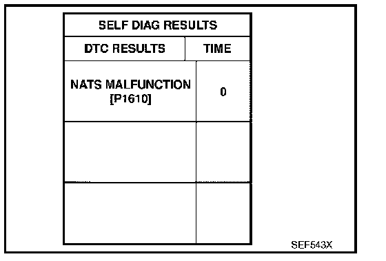 IVIS (Infiniti Vehicle Immobilizer System - NATS)- If the security indicator lights up with the ignition switch in the ON position or "NATS MALFUNCTION" is displayed on "SELF-DIAG RESULTS" screen, perform self-diagnostic results mode with CONSULT-II using NATS program card. Refer to BL-199, "IVIS (INFINITI VEHICLE IMMOBILIZER SYSTEM-NATS)". Infiniti Vehicle Immobilizer System (IVIS ) - NATS