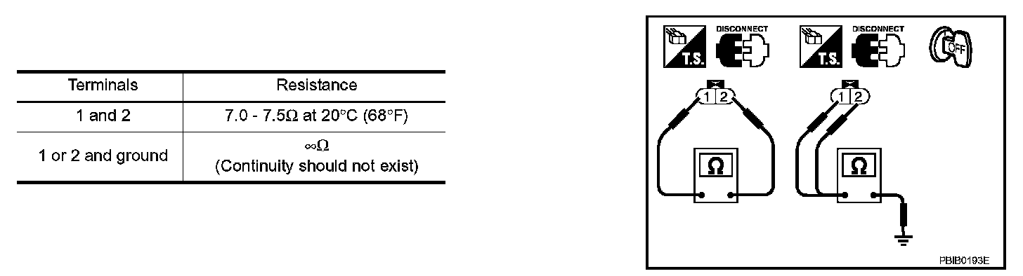 2. Check resistance between intake valve timing control solenoid valve terminals as follows.