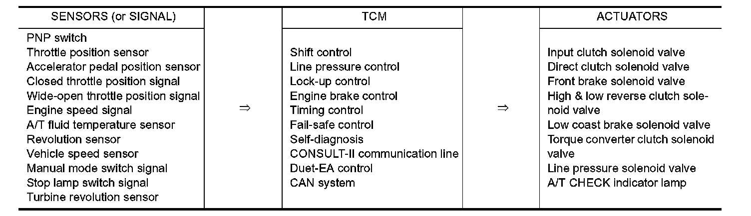 The automatic transmission senses vehicle operating conditions through various sensors or signals. It always controls the optimum shift position and reduces shifting and lock-up shocks.