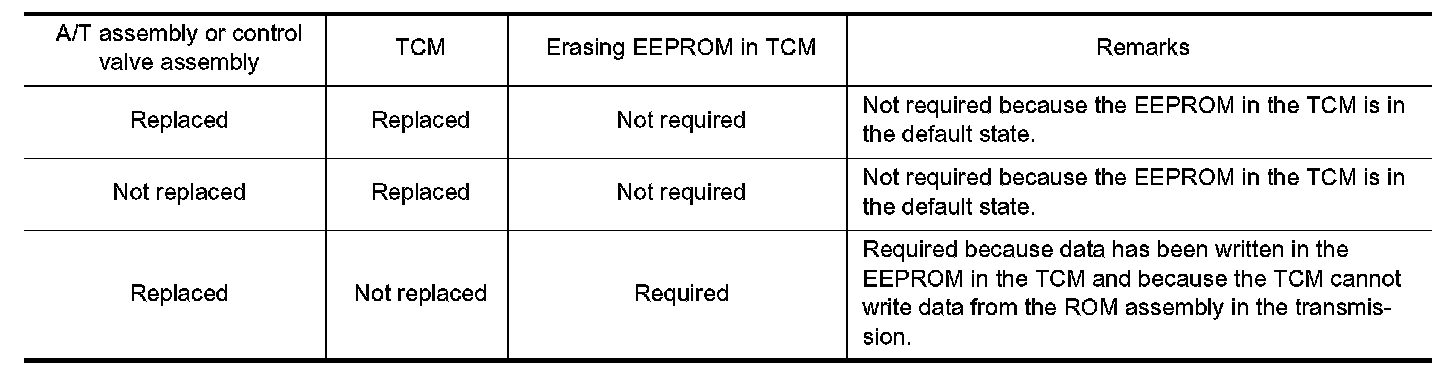 ^ When replacing A/T assembly, control valve assembly or TCM, refer to the pattern table and erase the EEPROM in the TCM if necessary.