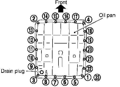 Tighten oil pan mounting bolts to the specified torque in numerical order shown in the figure after temporarily tightening them.