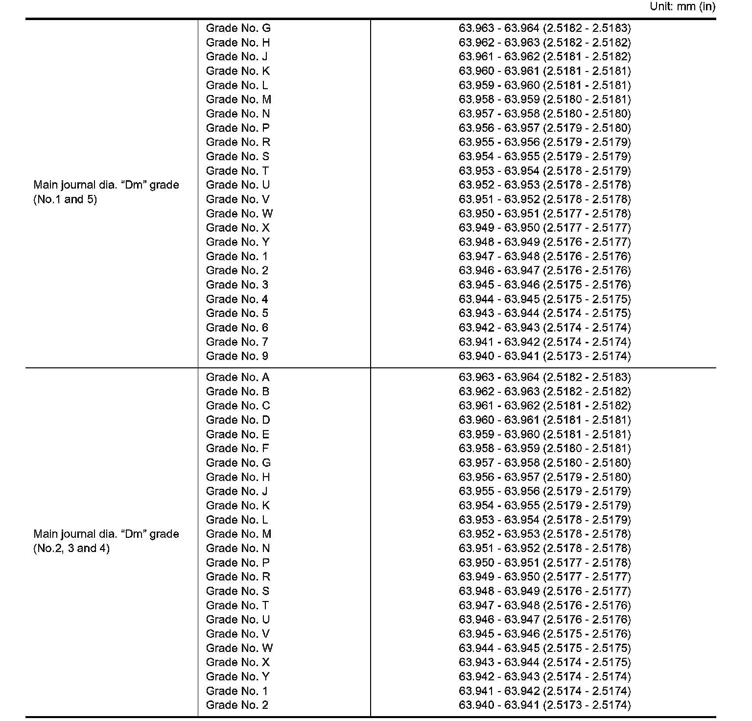 Standard: 63.940 - 63.964 mm (2.5173 - 2.5183 inch)