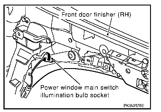 POWER WINDOW MAIN SWITCH ILLUMINATION1. Remove the front door finisher (RH). Refer to "FRONT DOOR FINISHER" in "EXTERIOR & INTERIOR (EI)" section.