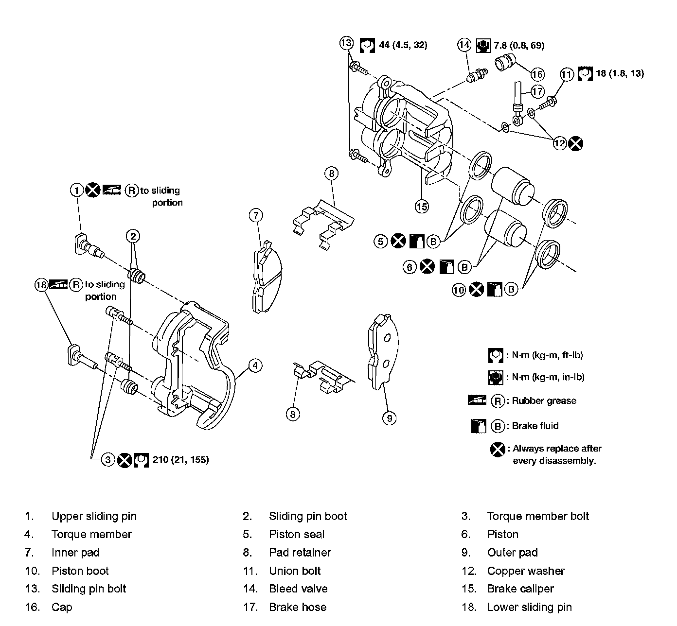 ^ It is not necessary to remove bolts on torque member and brake hose except for disassembly or replacement of brake caliper. In this case, hang brake caliper with a wire so as not to stretch brake hose.