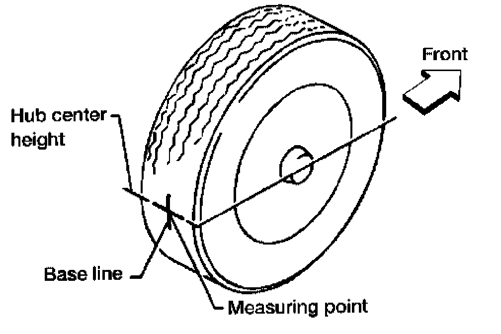 3. Put a mark on base line of the tread (rear side) of both front tires at the same height as hub center as shown. These marks are measuring points.