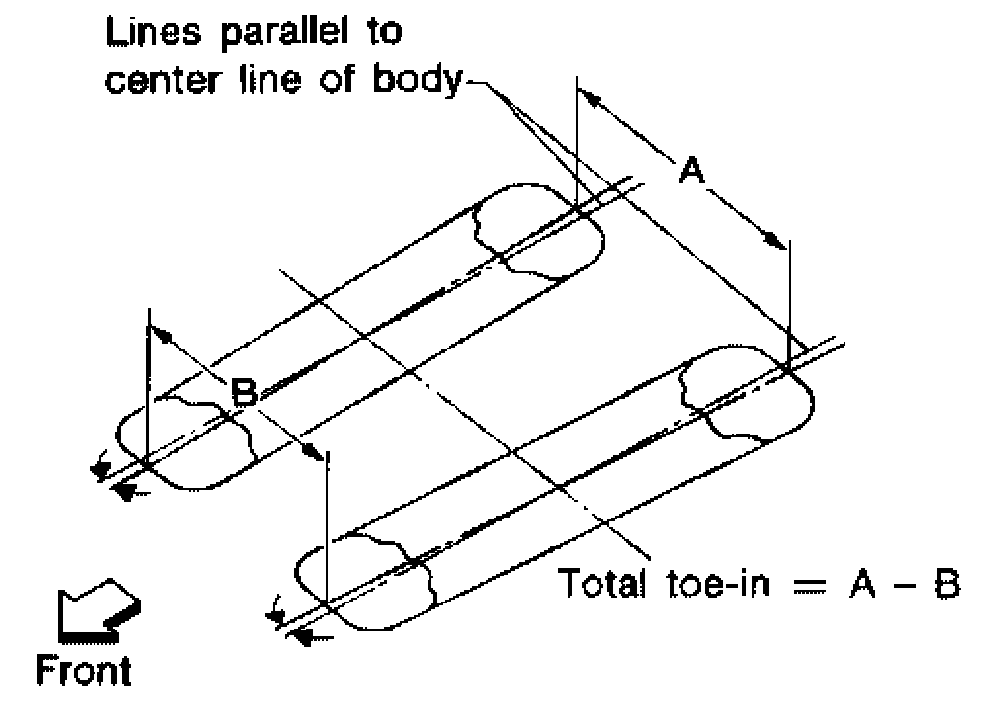 6. Measure the distance "B" on the front side of the front tires at the same marks as shown. Total toe-in is calculated as "A" - "B".