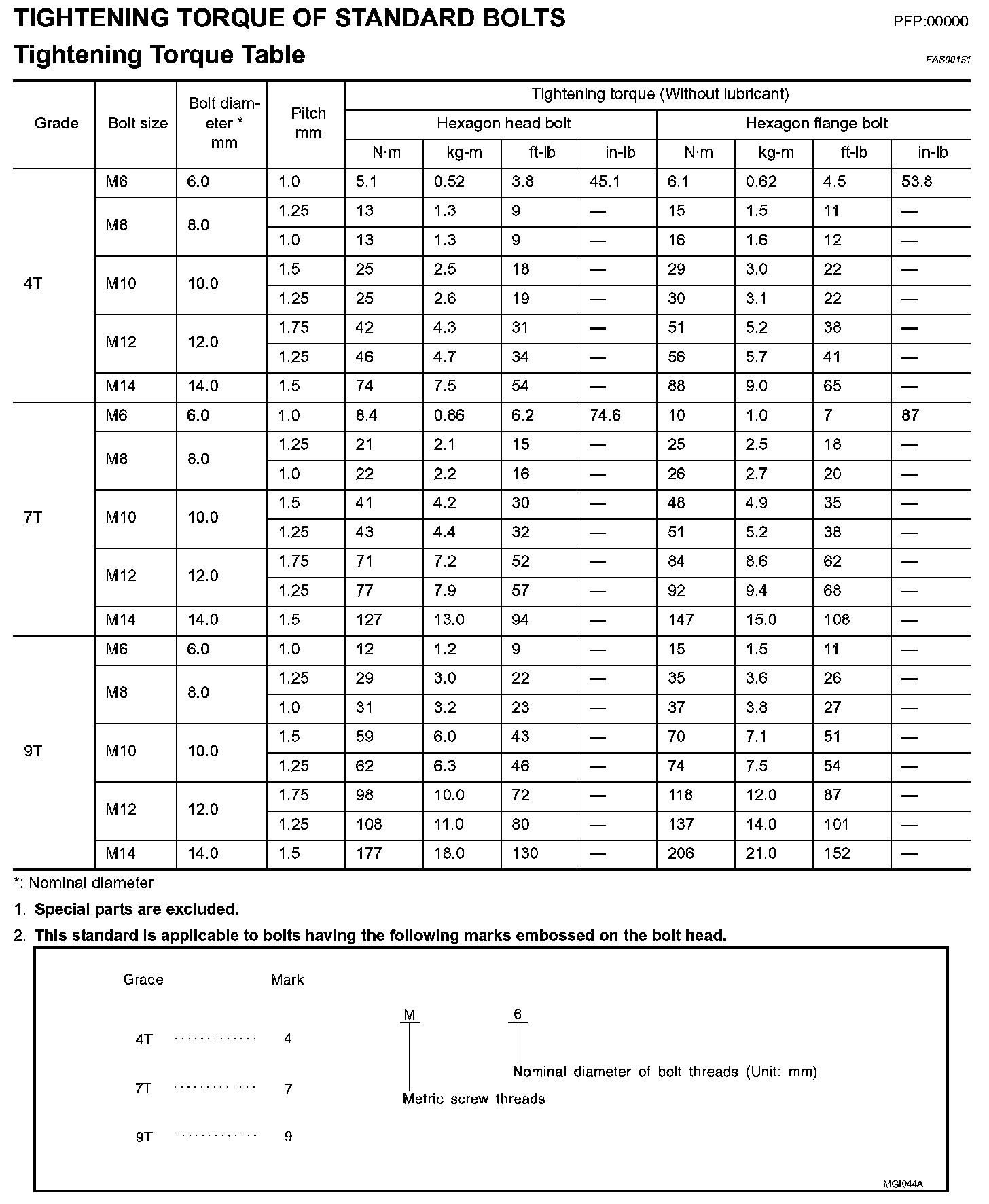 Tightening Torque Of Standard Bolts: