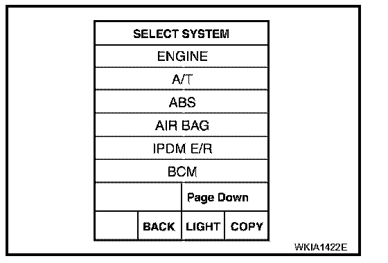 - If "IPDM E/R" is not displayed, print "SELECT SYSTEM" screen, go to "CONSULT-II Data Link Connector (DLC) Circuit". Diagnostic Aids